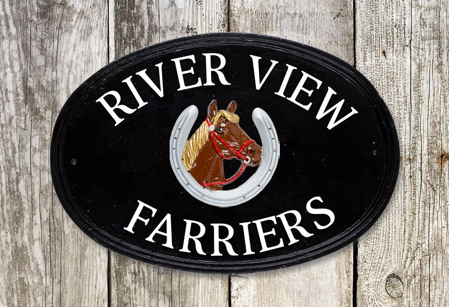 The cast oval House Sign is our best seller due to its heritage oval design and a large range of motif options. It can accommodate most name and number combinations along with an added motif if desired. The name can be cast on the center or following the oval shape of the plate. The sign is completed in a powder painting process after which your chosen design is beautifully finished in hand-painted enamel.