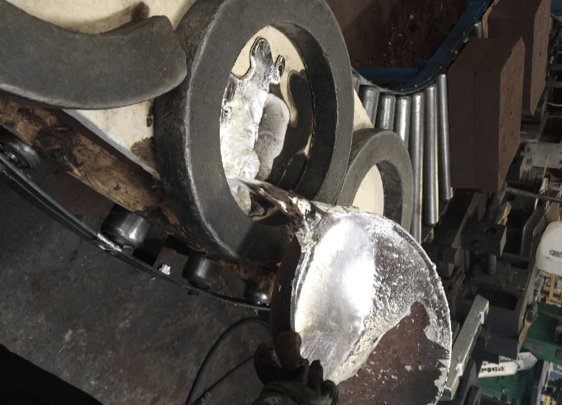 This aluminium is heated at approximately 670 degrees Celsius in our foundry furnace. The furnace is given time to heat to the necessary temperature level where the aluminium is melted sufficiently, and then this metal is poured into the sign container to produce the raw casting. The aluminium is poured at a careful rate so as not to damage the mould.