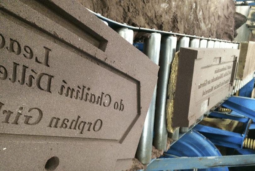 The next step is where a mould of the sign is made in the sand. All the containers vary in size depending on the sign being casted. The sand takes about twenty minutes to solidify, and once this is achieved hot molten metal is then poured into the sign to produce the raw casting.